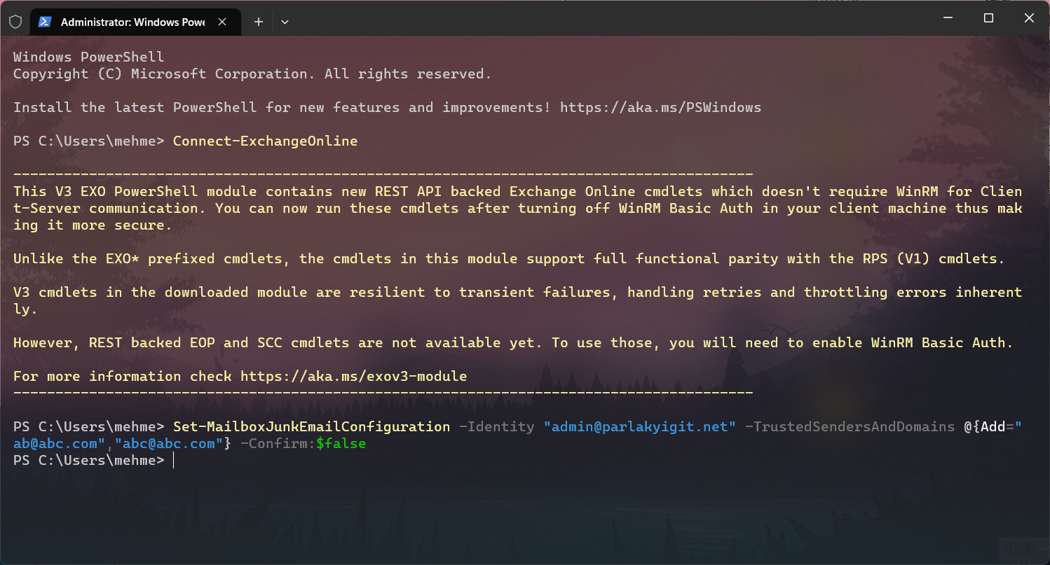 Connect-ExchangeOnline // Bu komuttan sonra Global admin hesabının bilgileri istenecektir.Set-MailboxJunkEmailConfiguration -Identity ilgili_kullanici@parlakyigit.net -TrustedSendersAndDomains @{Add=ab@abc.com,abc@abc.com} -Confirm:$false