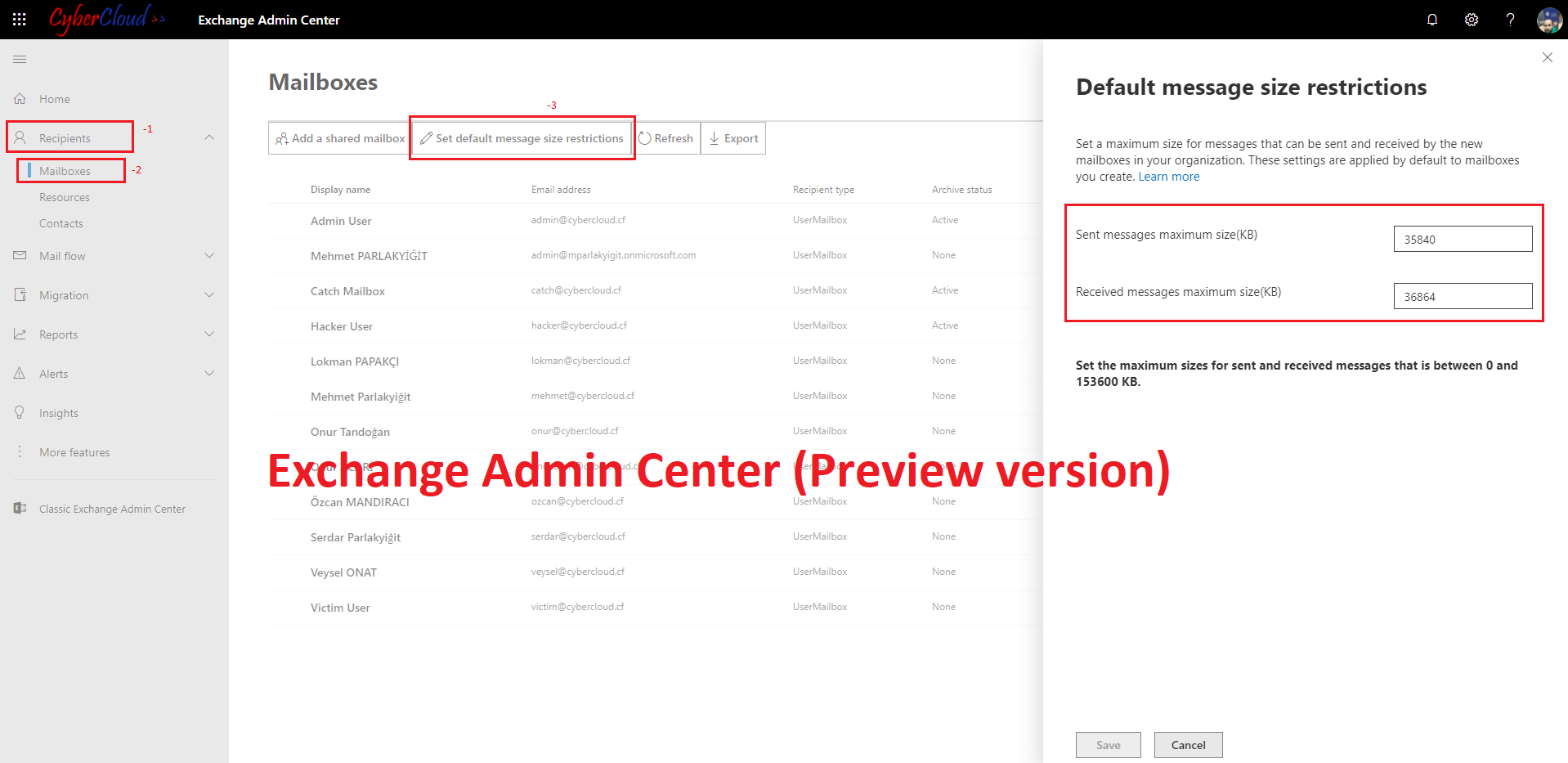 Office 365 gönderilen ve alınan iletilerin boyutunu tüm kullanıcılarınız için değiştirebilirsiniz. Max ileti boyutu, 153600 KB