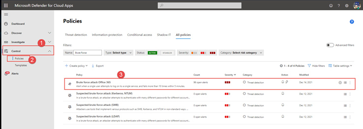 Öncelikle Microsoft Defender for Cloud Apps yönetim paneline admin yetkisine sahip bir kullanıcıyla giriş yapalım. Hemen ardından yukarıda ki adımları takip ederek Brute Force attack Office 365 ilkemize gidelim.