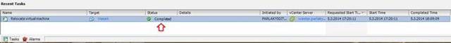 Migrate işlemi tamamlandığında Task üzerinde işlemin başarılı bir şekilde tamamlandığını görebiliriz. Şu durumda artık sanal makinemizin bulunduğu datastore üzerinden başka bir datastore üzerine taşımız bulunmaktayız.