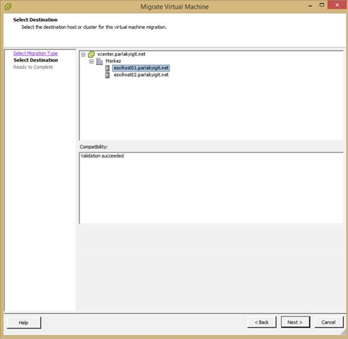 Select Destination ekranına geldiğimizde sanal makinemizi hangi hsot üzerine taşıyacağımızı sormakta sanal makinemiz daha önceden esxihost02 isimli hostumuz üzerinde olduğu için esxihost01 hostunu seçerek ilerliyorum.Bu arada hostlarım Merkez isimli  datacenter altındadır.