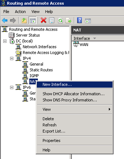 Yukarıda ki şekilde görüldüğü gibi servisimiz start olmuş durumda biz NAT servisini kurmuştuk. IPV4 altında bulunan NAT servisine sağ tıklayarak New Interface seçeneğini seçelim.