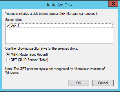 Karşımıza Initialize Disk penceresi açılacaktır. İlgili disk veya disklerin seçildiğinden emin olarak OK butonuna basıyoruz.